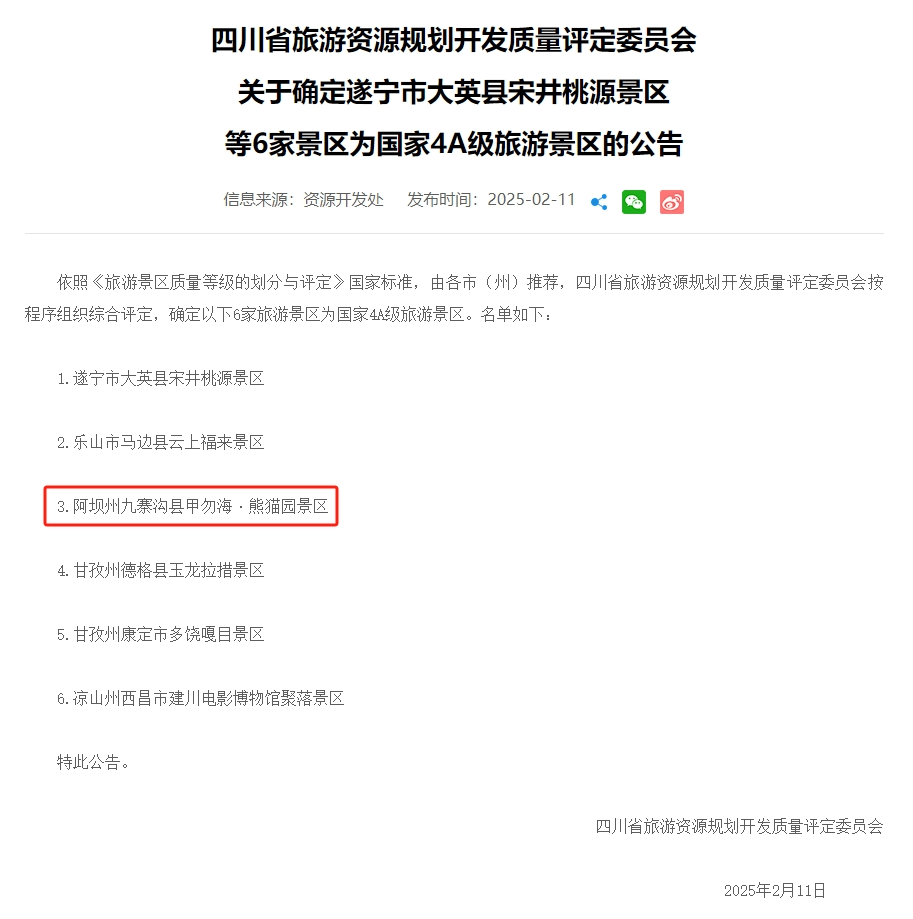 近日,四川省旅游資源規(guī)劃開發(fā)質(zhì)量評定委員會發(fā)布公告,遂寧市宋井桃源景區(qū)、樂山市馬邊縣云上福來景區(qū)、阿壩州九寨溝縣甲勿海·熊貓園景區(qū)、甘孜州德格縣玉龍拉措景區(qū)、甘孜州康定市多饒嘎目景區(qū)以及涼山州西昌市建川電影博物館聚落景區(qū)已順利通過公示期,并正式確認(rèn)為國家4A級旅游景區(qū)。